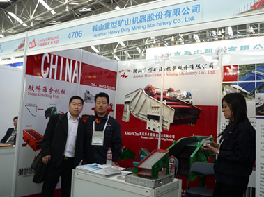 鞍山重型礦山機器股份有限公司在礦業(yè)大會展覽臺工作人員與中國振動機械網(wǎng)楊經(jīng)理合影