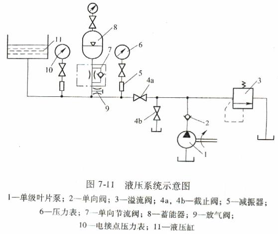 圖7-11液壓系統(tǒng)示意圖1-單級葉片泵;2 -單向閥:3-溢流閥;4a,4b-截止閥;5-r振器;6-壓力表;7-單向節(jié)流閥;8-蓄能器;9 -放氣閥;10-電接點壓力表;11-液壓缸當非破碎物落入破碎腔時,造成破碎力急劇增加,系統(tǒng)油壓也隨之升高。當系統(tǒng)油壓高于蓄能器油壓時,液壓缸中的液壓油通過單向節(jié)流閥7進入菁能器(此時液壓缸的油壓和蓄能器的氣壓,在1.1~1. 5MPa之間波動,暫時平衡)。與此同時,動錐下落,排料口增大,非破碎物即排出。非破碎物排出之后,由于破碎力急劇下降,系統(tǒng)的油壓也下降,蓄能器中的壓力油經(jīng)過節(jié)流閥7緩慢地進 入液壓缸,使動錐緩慢地自動復(fù)位。