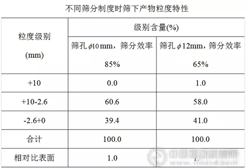 由上表可看出,第二種篩分工作制度,篩下產(chǎn)物中大于l0mm的礦粒不多,而-2.6~+0mm細(xì)粒級(jí)卻比第一種制度有所增加,而篩子能力由于第二種制度下加大了篩孔而顯著增加,還可減少篩子安裝臺(tái)數(shù)。