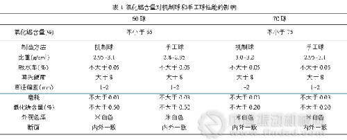 (1) 中鋁球石根據(jù)氧化鋁含量分為60球和70球,即氧化鋁含量超過60%或70%的瓷球;根據(jù)制造方法分有手工球和機制球,質(zhì)量有較大區(qū)別,購買使用時要慎重。表1列出了它們的區(qū)別和選取質(zhì)量要點。