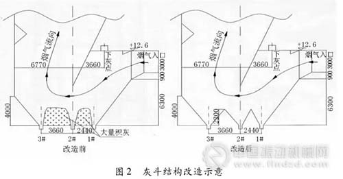 原設(shè)計(jì)脫硫塔的塔底為平底,布置有1 # 、2 # 、3 # 脫硫劑循環(huán)出料口,靠近煙氣進(jìn)口的為1 #出料口,1 # 出料口上方正對(duì)著經(jīng)雙軸攪拌加濕機(jī)加濕攪拌后的加料下灰口,循環(huán)脫硫劑經(jīng)加濕攪拌后進(jìn)入脫硫塔,與煙氣中的SO 2 發(fā)生化學(xué)反應(yīng),形成硫酸鈣和亞硫酸鈣,從而脫除煙氣中的SO 2 。加濕攪拌后的脫硫劑進(jìn)入脫硫塔后,由于自身重力,并不能全部隨煙氣流一起進(jìn)入脫硫塔上方繼續(xù)參與脫硫反應(yīng),其中的大顆粒依粒徑大小依次落入1 # 、2 # 、3 # 出料口,在出料口處由氣力輸送方式輸送至雙軸攪拌加濕機(jī)內(nèi),反復(fù)以上過(guò)程。從而導(dǎo)致塔底的循環(huán)脫硫劑系統(tǒng)出現(xiàn)“短路”現(xiàn)象,大顆粒脫硫劑不能參與脫硫系統(tǒng)的大循環(huán),水分和質(zhì)量越長(zhǎng)越大,形成了局部惡性循環(huán)。塔底的“平底船式”灰斗結(jié)構(gòu)加劇了這一過(guò)程,大量脫硫劑堆積于死角并出現(xiàn)板結(jié),導(dǎo)致灰斗的實(shí)際利用空間大幅降低,嚴(yán)重時(shí)造成塔底1 # 、2 # 給料機(jī)及輸灰管道出現(xiàn)堵塞,影響脫硫效果。為了解決此問(wèn)題,將脫硫塔原設(shè)計(jì)的“平底船式”大灰斗改造為3 個(gè)錐形料斗,使脫硫劑在灰斗內(nèi)不能留存,全部參與系統(tǒng)的循環(huán),提高了脫硫劑的循環(huán)量,促使脫硫劑加水過(guò)程更加均勻,塔底脫硫劑水分降低了0. 4% ~0. 5%,雙軸加濕機(jī)循環(huán)脫硫劑白灰的水分降低了0. 6% ~0. 8%,為后期增大加水量、提高脫硫率提供了條件。灰斗改造前后的塔底脫硫劑水分、雙軸加濕機(jī)循環(huán)脫硫劑水分對(duì)比分別見(jiàn)表2與表3,灰斗結(jié)構(gòu)改造示意見(jiàn)圖2。