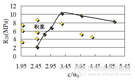試件強(qiáng)度與積漿情況見表1,28d強(qiáng)度與C/W0關(guān)系如圖2所示。在圖2中,曲線左上方試驗(yàn)點(diǎn)均存在積漿現(xiàn)象;曲線下方的若干試驗(yàn)點(diǎn)屬于漿量不足,強(qiáng)度沒有達(dá)到最優(yōu)。不積漿并且強(qiáng)度相對(duì)較高的試樣連接成曲線,從連接線的形狀來看,透水混凝土強(qiáng)度與C/W0不成線性關(guān)系,說明透水混凝土的強(qiáng)度并不符合鮑羅米公式表述的規(guī)律,而存在最佳灰水比。