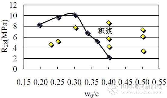 (4)作透水用途的無砂混凝土屬于骨架空隙結(jié)構(gòu),水灰比的減小使凈漿強(qiáng)度增加;水灰比的適量增大使凈漿流動(dòng)性增加,也就改善了粘結(jié)效果,有利于提高透水混凝土的強(qiáng)度。在不積漿條件下,凈漿強(qiáng)度與流動(dòng)性矛盾達(dá)到平衡時(shí)的水灰比為最佳水灰比。