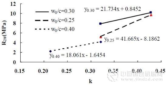 當(dāng)填隙系數(shù)均為k=0.32時(shí),W0/C≈0.40和W0/C≈0.25時(shí)的強(qiáng)度均低于W0/C≈0.30時(shí)的強(qiáng)度;在試驗(yàn)范圍內(nèi)W0/C≈0.30趨勢(shì)線整體位于另外兩條趨勢(shì)線(及延長(zhǎng)線)之上,即對(duì)于強(qiáng)度而言最佳水灰比約為0.30。
