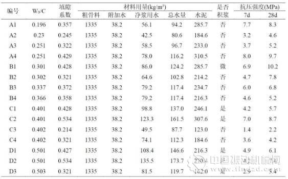 ?取粗骨料間的緊密系數(shù)為0.97,在次緊密堆積狀態(tài)下空隙率為42%,記凈漿用水量為W0,水泥用量為C,吸入粗骨料顆粒內(nèi)的附加水量為W1,每立方米拌和物中粗骨料顆粒間的空隙體積為Vo,則凈漿體積Vp=Vc+Vw0,凈漿體積占粗骨料空隙體積之比本文稱為填隙系數(shù),即k=Vp/Vo.試驗(yàn)按凈漿水灰比W0/C=0.2~0.5以及填隙系數(shù)k=0.2~0.5,設(shè)計(jì)一系列配合比進(jìn)行試拌。在試拌過程中邊攪拌、邊加水、邊觀察凈漿稠度,當(dāng)目測(cè)凈漿泛光時(shí)停止加剩余的水,如果達(dá)不到泛光程度再補(bǔ)充少許水量,整理后的試驗(yàn)配合比見表1。成型拆模后觀察試件底部及側(cè)面是否積漿,標(biāo)準(zhǔn)養(yǎng)護(hù)至7d和28d 齡期,參照GB/T 50081—2002《普通混凝土力學(xué)性能試驗(yàn)方法標(biāo)準(zhǔn)》測(cè)定抗壓強(qiáng)度。