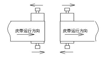 1.調(diào)整承載托輥組。皮帶機(jī)的皮帶在整個(gè)皮帶運(yùn)輸機(jī)的中部跑偏時(shí)可調(diào)整托輥組的位置來(lái)調(diào)整跑偏;在制造時(shí)托輥組的兩側(cè)安裝孔都加工成長(zhǎng)孔,以便進(jìn)行調(diào)整。具體調(diào)整方法見圖1。具體方法是皮帶偏向哪一側(cè),托輥組的哪一側(cè)朝皮帶前進(jìn)方向前移,或另外一側(cè)后移。如圖1所示皮帶向上方向跑偏,則托輥組的下位處應(yīng)當(dāng)向左移動(dòng),托輥組的上位處向右移動(dòng)。