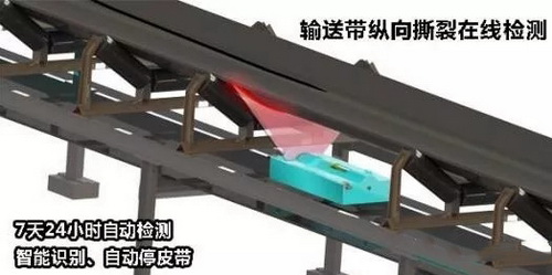 在輸送帶中加入帶有閉合線圈的傳感器,檢測(cè)器安裝在帶式輸送機(jī)的易撅裂部位,檢測(cè)器連接在控制器上。輸送帶正常運(yùn)行時(shí),傳感器經(jīng)過檢測(cè)器,檢測(cè)器發(fā)出脈沖。當(dāng)輸送帶撕裂,切斷傳感器線圈,傳感器經(jīng)過檢測(cè)器時(shí),檢測(cè)器停止發(fā)出脈沖,控制器接受后,發(fā)出報(bào)警信號(hào)并停機(jī)。