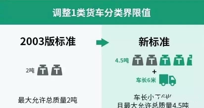 3. 新的車型劃分標(biāo)準(zhǔn)中,將1類和2類貨車分類界限值,確定為車長(zhǎng)小于6米且最大允許總質(zhì)量4.5噸。