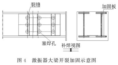 激振器大梁是設(shè)備強(qiáng)度最高的部位,發(fā)生開裂的情況甚少,但現(xiàn)場(chǎng)條件各有不同,若有開裂,其加固方案和底梁類似,但其坡口深度與鋼板厚度一致,焊接質(zhì)量要求高,副板以16mm~20mm鋼板為主,必要時(shí)副板上增加強(qiáng)筋。