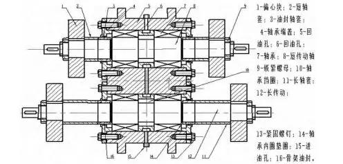 從圖2可以看出,在激振器殼體(5)側(cè)面分別鉆通進(jìn)油孔(15)和(6),在原來軸承凹迷宮端蓋的基礎(chǔ)上加裝兩個(gè)骨架油封(16)改為軸承端蓋(4),同時(shí)在原來凸迷宮端蓋上改為內(nèi)鑲兩道“o”型圈的油封軸套(3),另外在長、短傳動(dòng)軸(8)、(12)的軸承(7)的軸向位置上,各增加一個(gè)軸承內(nèi)圈墊圈(14),壓緊軸承。