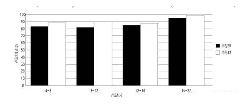沖程就是圓錐破碎機松邊排放口至緊邊排放口的距離。在現(xiàn)場我們用1218單缸液壓圓錐破機2種不同沖程,破碎相同的石料,生產(chǎn)出來的石料進行比較。具體數(shù)據(jù)見圖1。