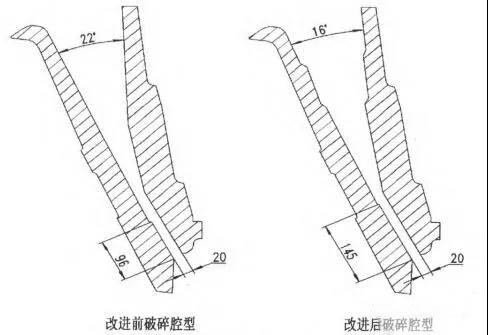 改進后破碎腔嚙角由22°變?yōu)?6°,嚙角的減小可以夾住較大石料,防止破碎時石料往上跳,這樣破碎腔中石料填充率提高,形成層壓破碎,減少產(chǎn)品石料針片狀含量,優(yōu)化產(chǎn)品粒度。