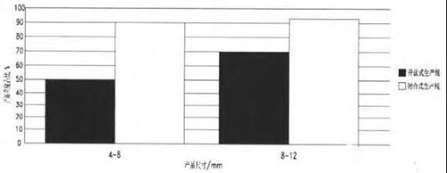 由圖3可得閉合式生產(chǎn)線所生產(chǎn)的產(chǎn)品粒度占比遠遠高于開放式生產(chǎn)線。原因是不合格的返料多次破碎,成品形狀更好,特別是細料產(chǎn)品更突出。