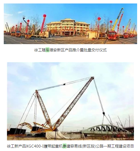 徐工新產(chǎn)品XGC400-I履帶起重機參建容易線(新區(qū)段)公路一期工程建設(shè)項目;交付20臺12噸G系列隨車起重機;價值近2000萬的徐工QY70KC汽車起重機直奔雄安高鐵站以及容東片區(qū)綜合管廊項目……