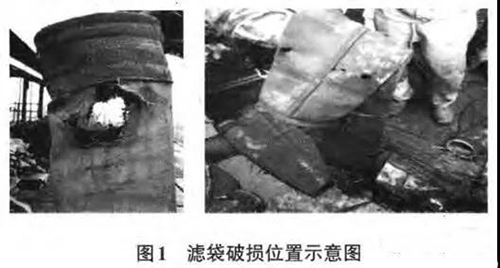 氣流沖刷引起的破損失效主要是由清灰時的高壓氣流直接噴吹到濾袋上部、煙氣進風(fēng)方式、煙氣濃度過大、煙氣過濾速度過大和煙氣上升速度過大引起的。