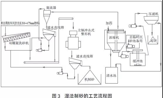 濕法制砂是應(yīng)用洗砂機(jī)的水洗制砂模式,借助水力方式除粉,通過(guò)水洗大量去除砂粒中泥粉含量,使機(jī)制砂含粉量較低。