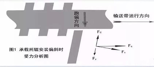 輸送機(jī)在運(yùn)轉(zhuǎn)過程中,若輸送帶在承載段向一側(cè)跑偏,表明承載托輥組安裝位置與輸送機(jī)中心線的垂直度有誤差,如圖1所示。輸送帶在運(yùn)行方向上給托輥一個(gè)牽引力Fq,F(xiàn)q分解為切向力Fz和軸向力Fc,切向力Fz克服托輥?zhàn)枇?,使托輥旋轉(zhuǎn),軸向力Fc作用在托輥上,使托輥沿軸向竄動(dòng),由于托輥是固定的,不能軸向竄動(dòng),這樣就給輸送帶一個(gè)反作用力Fy,它使輸送帶向另一側(cè)移動(dòng),從而導(dǎo)致了輸送帶跑偏。