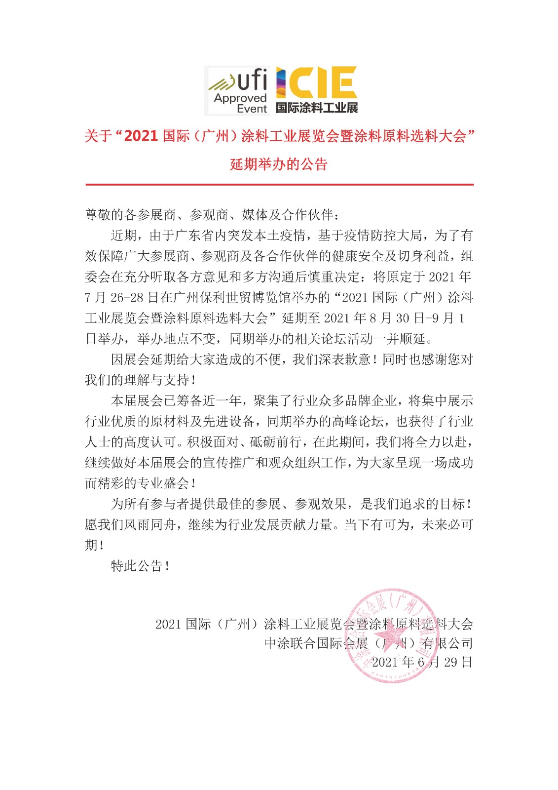 - 關(guān)于“2021國(guó)際(廣州)涂料工業(yè)展覽會(huì)”延期舉辦的公告...(2021-07-01)