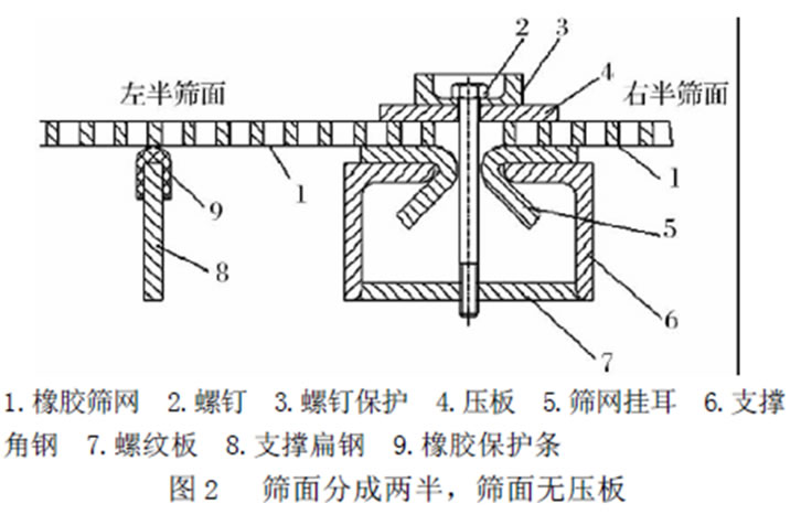 (2)有的篩面較寬的振動(dòng)篩則將篩網(wǎng)分成兩半。如圖2所示,中間由壓板、螺釘將篩網(wǎng)壓住,兩頭用張緊鉤將篩網(wǎng)向篩框方向張緊。這種方式在初次安裝時(shí)尚可,多次安裝后,由于固定在篩框梁上的帶內(nèi)螺紋的固定板上的螺紋會(huì)銹死,導(dǎo)致螺釘拆不出來(lái),給檢修帶來(lái)很多不便。另外,從篩網(wǎng)失效的情況看,雖然篩網(wǎng)變短了,但篩網(wǎng)摩擦扯斷的局面沒(méi)有明顯改善。