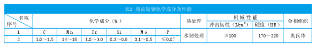 近年來,通過在普通高錳鋼(Mn13)的標(biāo)準(zhǔn)組成的基礎(chǔ)上增加碳和錳的含量,開發(fā)了超高錳鋼。將錳含量(質(zhì)量分?jǐn)?shù))增加至14%至18%,并添加1%至3%的Cr和適量的Ti,V,Mo等合金強(qiáng)化元素。化學(xué)成分和性能如表2所示。超高錳鋼比普通高錳鋼具有更好的變形強(qiáng)化能力(加工硬化率)。在相同形狀變量下,超高錳鋼比普通高錳鋼具有更高的變形硬度。如果變形為20%,普通高錳鋼的變形硬度約為360HB,超高錳鋼的變形硬度為400HB。超高錳鋼的使用壽命是普通高錳鋼在磨損或強(qiáng)沖擊和高壓下的鑿磨損方面的1.5至2倍。