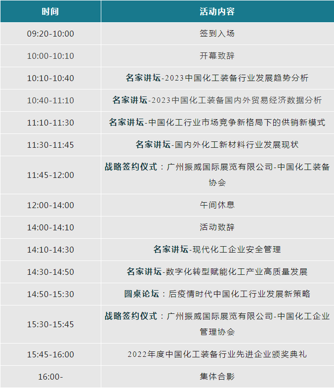活動(dòng)名稱(chēng):2023中國(guó)化工裝備高峰論壇暨2022中國(guó)化工裝備行業(yè)先進(jìn)企業(yè)年度總評(píng)榜頒獎(jiǎng)典禮