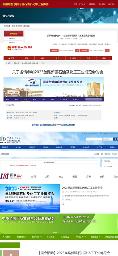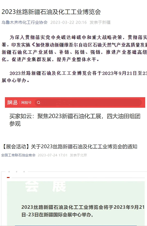 自會議籌備至今,博覽會受到了政府部門、各大商會、協(xié)會和媒體行業(yè)廣泛關(guān)注,包括CCTV、人民日報、經(jīng)濟日報、新華社、中國新聞社、中國日報、科技日報、新疆衛(wèi)視、烏魯木齊電視臺、兵團衛(wèi)視、新疆日報、烏魯木齊晚報、兵團日報、新疆都市報、中國石油新聞中心、奇臺縣人民政府、新疆維吾爾自治區(qū)石油和化學(xué)工業(yè)協(xié)會、國家級庫爾勒經(jīng)濟技術(shù)開發(fā)區(qū)、中華全國工商業(yè)聯(lián)合會石油業(yè)商會、中國石化新聞網(wǎng)、中國能源網(wǎng)、泵閥制造網(wǎng)、網(wǎng)易、中國泵閥網(wǎng)、國聯(lián)、中國網(wǎng)、5G頭條、全球石油化工網(wǎng)、洛克斯石油網(wǎng)、能源界、中國石油和化工網(wǎng)、國家能源網(wǎng)、蓋德化工網(wǎng)、慧聰石油網(wǎng)等200余家權(quán)威媒體和行業(yè)媒體的關(guān)注,以下截圖為部分媒體報道。