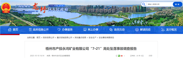 10月10日,廣西梧州市龍圩區(qū)人民政府公布梧州市產(chǎn)投永鴻礦業(yè)有限公司“7·21”高處墜落事故調(diào)查報(bào)告。報(bào)告顯示,2025年7月21日凌晨5時(shí)55分,該公司旗下梧州市龍圩區(qū)社學(xué)鳳凰頂建筑用砂巖礦發(fā)生一起人員高處墜落事故,最終造成1人死亡。