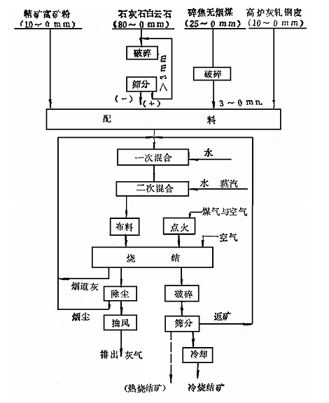 其中溶劑由于礦石脈石和焦炭粉多系酸性氧化物,所以高爐主要用堿性熔劑,如石灰石(CaCO3)、白云石(CaCO3•MgCO3)等。當(dāng)高爐使用含堿性脈石的鐵礦石冶煉時(shí),需要加入酸性熔劑。但實(shí)際生產(chǎn)中只是采用兌入酸性礦石的辦法,很少使用酸性熔劑。由于溶劑的粒度最好是與礦石的粒度相同,有利于造渣,因此,溶劑在配料之前也要進(jìn)行破碎篩分的工藝回路。焦炭作為高爐燃料也是十分重要的,為了實(shí)現(xiàn)塊度均勻的燃料,配料之前焦炭也要破碎到一定粒度。如圖再進(jìn)行一系列的步驟,原本的礦粉就成了燒結(jié)礦。
