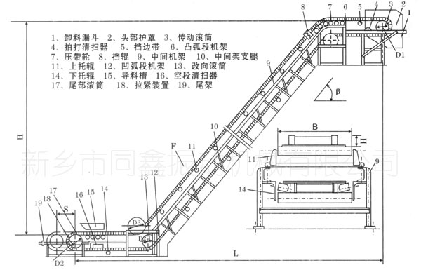 大傾角皮帶輸送機(jī)(擋邊帶式輸送機(jī))產(chǎn)品外形結(jié)構(gòu)示意圖: