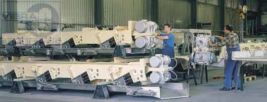 圖4:共振槽式輸送機的組裝線,振動馬達置于頂部。