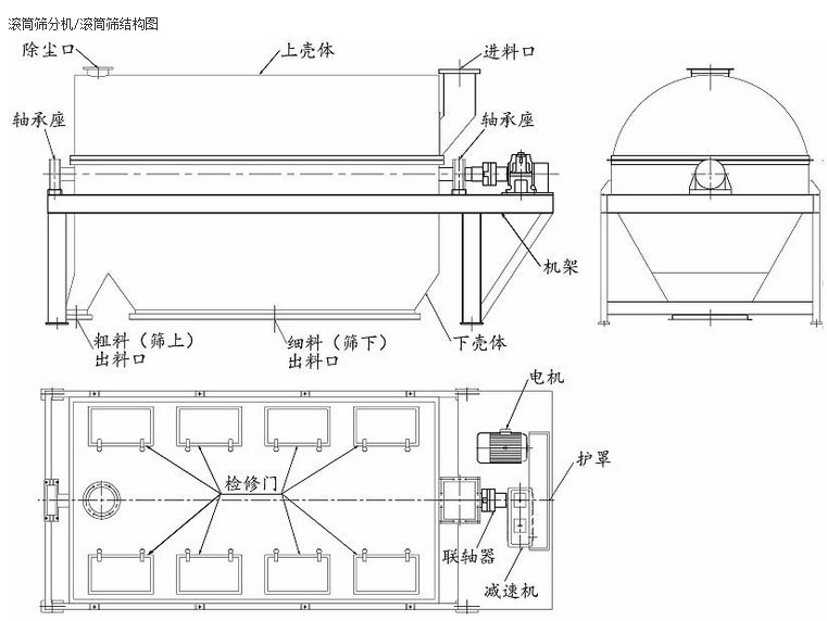 7、設(shè)備噪音低 :滾筒篩(圓筒回轉(zhuǎn)篩)運(yùn)行中,由于回轉(zhuǎn)篩速度小,并且有密封隔離罩與外界隔離,使噪音無法傳遞到外部,從而降低了設(shè)備噪音。