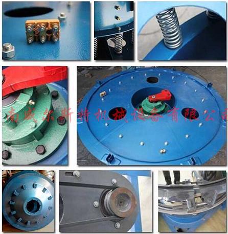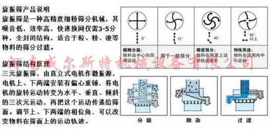 WXZ系列旋振篩,由直立式電機作激振源,電機上、下兩端安裝有偏心重錘,將電機的旋轉(zhuǎn)運動轉(zhuǎn)變?yōu)樗?、垂直、傾斜的三次元運動,再把這個運動傳遞給篩面。調(diào)節(jié)上、下兩端的相位角,可以改變物料在篩面上的運動軌跡。