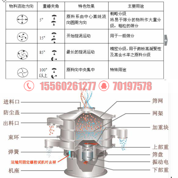 旋振篩是一種高精度細粉篩分機械,其噪音低、效率高,快速換網需3-5分鐘,全封閉結構,適用于粒、粉、粘液等物料的篩分過濾。旋振篩是由直立式電機作激振源,電機上、下兩端安裝有偏心重錘,將電機的旋轉運動轉變為水平、垂直、傾斜的三次元運動,再把這個運動傳遞給篩面。調節上、下兩端的相位角,可以改變物料在篩面上的運動軌跡。