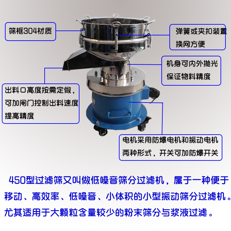 450型過濾篩采用新型立式振動電機為振動源,立式振