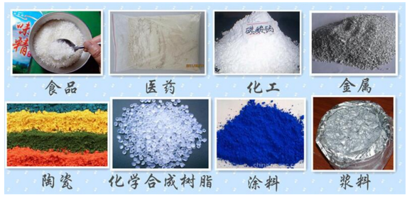 化工行業(yè):樹脂粉、顏料、洗衣粉、微粉、油漆、純堿、檸檬粉、橡膠、塑料等。磨料、