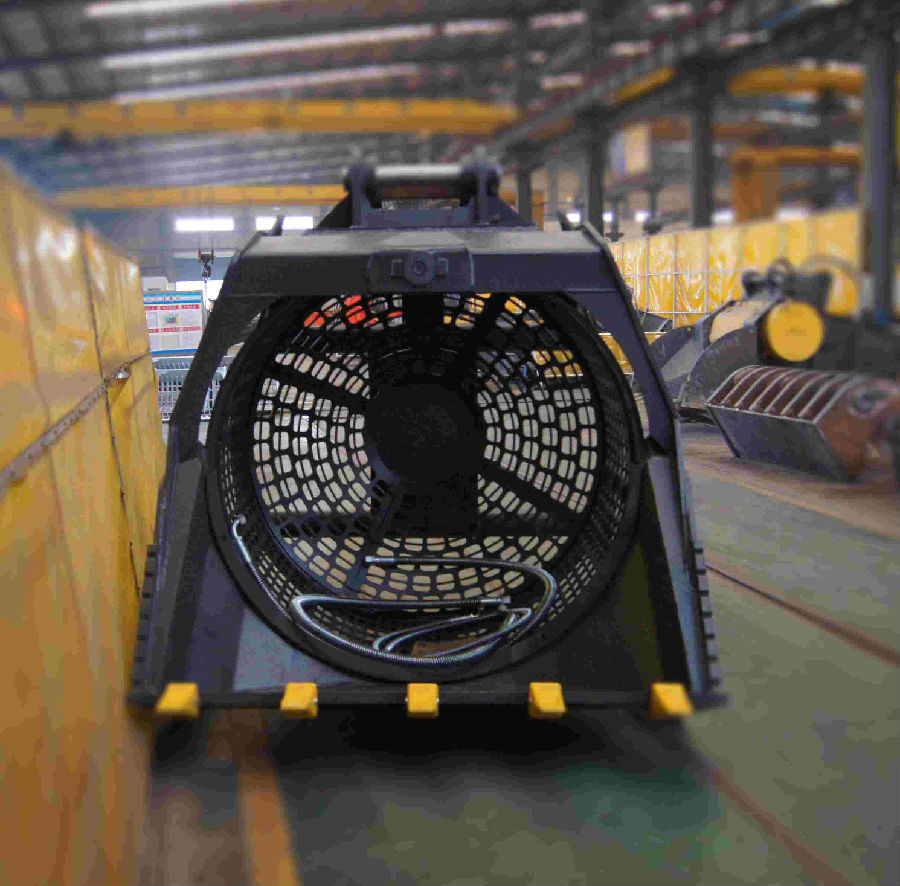 滾筒裝置安裝于挖掘機上。油缸與滾筒裝置連接在一起,液壓馬達驅(qū)動滾筒裝置繞其軸線轉(zhuǎn)動。當(dāng)物料進入滾筒裝置后,由于滾筒裝置的高速轉(zhuǎn)動,使篩面上的物料翻轉(zhuǎn)與滾動,使合格物料(篩下產(chǎn)品)經(jīng)滾筒后端底部的出料口排出,不合格的物料(篩上產(chǎn)品)經(jīng)滾筒尾部的排料口排出。由于物料在滾筒內(nèi)的翻轉(zhuǎn)、滾動,使卡在篩孔中的物料可被彈出,防止篩孔堵塞。與滾筒篩的原理構(gòu)造幾乎相同,安裝在挖掘機上更靈活,移動更方便,為工程提供了更好的支持.