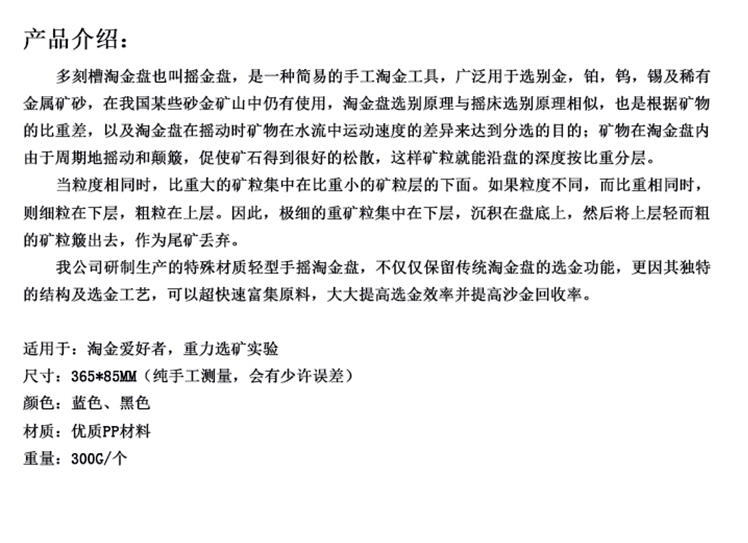 此款淘金盤適合對手工淘金有興趣入門的初學者和條件比較簡陋的偏遠山區(qū),交通不方便的河道里使用,方便攜帶,隨時隨地都可操作。