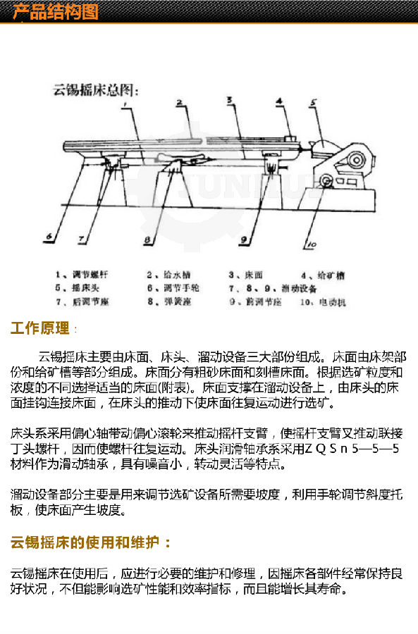 6-S搖床(6-S shaking table)是用于選別細(xì)粒物料的重力選礦設(shè)備,廣泛應(yīng)用于選別錫、鎢、金銀、鉛、鋅、鉭、鈮、鐵、錳、鈦鐵和煤等。