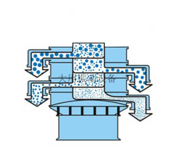 由直立電機(jī)作振動(dòng)源,上下兩端安裝有偏心錘將電機(jī)的旋轉(zhuǎn)運(yùn)動(dòng)轉(zhuǎn)換成水平-垂直-傾斜三次元運(yùn)動(dòng),然后這個(gè)運(yùn)動(dòng)傳遞給篩面,使物料在篩面上做外擴(kuò)漸開(kāi)線運(yùn)動(dòng),具有物料運(yùn)行的軌跡長(zhǎng),篩面利用率高等優(yōu)點(diǎn),可以對(duì)物料進(jìn)行精篩分、概率篩分。通過(guò)改變振動(dòng)電機(jī)的上下2塊偏心塊的夾角和質(zhì)量,振動(dòng)電機(jī)即可帶動(dòng)設(shè)備產(chǎn)生不同大小的振動(dòng)力,從而改變水平或垂直方向的振動(dòng)幅度,進(jìn)而改變篩分的流量和效率。