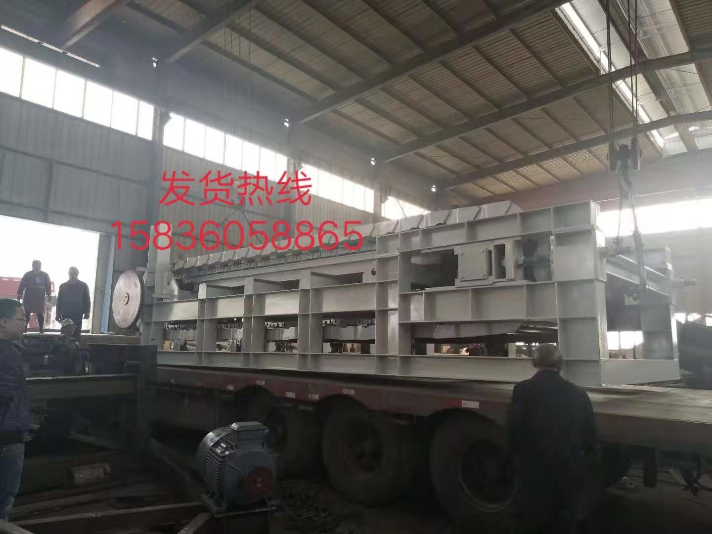 采用節(jié)距為228.6mm(9吋)的高強(qiáng)度推土機(jī)模鍛鏈條為牽引件,兩根鏈條繞過安裝在機(jī)體頭部的一對(duì)驅(qū)動(dòng)鏈輪和機(jī)體尾部的一對(duì)張緊輪聯(lián)成封閉形回路,在兩排鏈條的每個(gè)鏈節(jié)上裝配了相互交迭的、重型結(jié)構(gòu)的輸送槽而成為一個(gè)連續(xù)的能夠運(yùn)載物料的輸送線路。其自重和物料的重量由安裝在機(jī)體上的多排支重輪、鏈托輪和滑道梁支承。傳動(dòng)系統(tǒng)經(jīng)交流變頻調(diào)速電動(dòng)機(jī)聯(lián)接減速機(jī),再由漲套與驅(qū)動(dòng)裝置直聯(lián)驅(qū)動(dòng)運(yùn)載機(jī)構(gòu)低速運(yùn)行。將尾部料倉卸入的物料沿輸送線路運(yùn)至機(jī)體的前方排出,實(shí)現(xiàn)向下方的工作機(jī)械連續(xù)均勻喂料的目的。