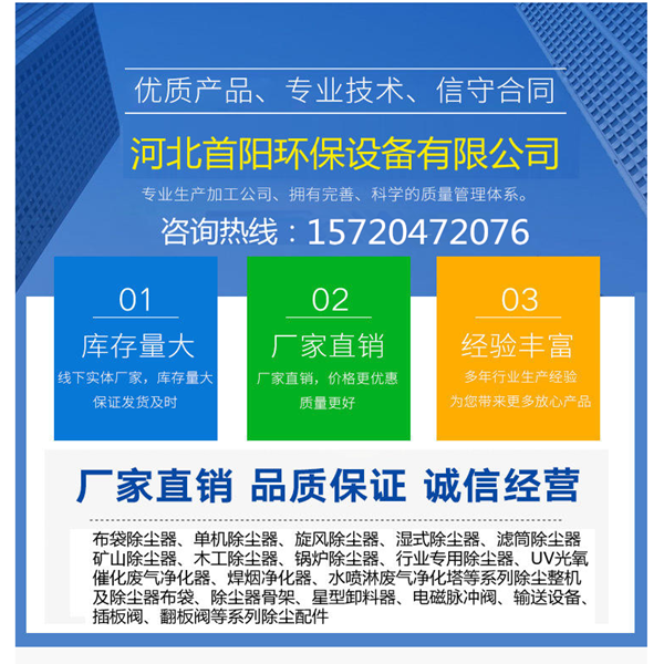 河北首陽環(huán)保設(shè)備有限公司小張電話; 15720472076 0317-8250076 QQ:3187005395 小張歡迎來電咨詢,首陽環(huán)保期待您的致電詢價訂購。我公司本著質(zhì)量第.一,價.格合理,信守合同,技術(shù)咨詢,代ban托運的原則,竭誠為廣大用戶服務(wù),本公司還 .業(yè)生產(chǎn)電除塵配件,芒刺線、陰極板、陽極板、振打錘、塵中軸承、頂部人孔門、瓷絕緣子,脈沖布袋除塵器、倉頂除塵器、旋風(fēng)除塵器、濕式脫硫除塵器、靜電除塵器及布袋骨架、脈沖電磁閥、脈沖控制儀、氣缸、布袋吊掛、文士管、螺旋輸送機、卸料器、插板閥等各種除塵器配件,集同類產(chǎn)品凈化于一身,使用戶跑百家不如走一家,不僅可以買到產(chǎn)品又能得.到技術(shù)和信任。質(zhì)優(yōu)價廉,保證讓用戶省下幾倍的錢,買到我們的優(yōu).質(zhì)產(chǎn)品,本公司產(chǎn)品質(zhì)量保證,供貨及時。“用戶滿意,我的追求”是我公司的售后服務(wù)宗旨。
