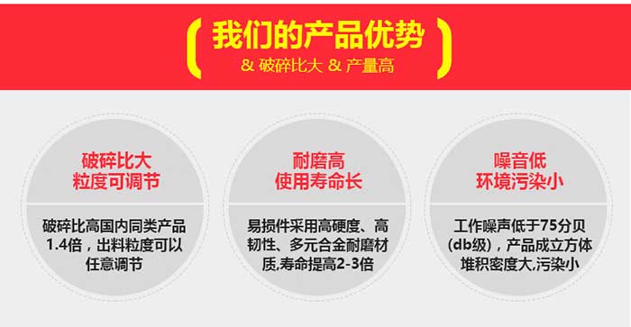 該設(shè)備破碎比大,破碎水分含量高,對(duì)水分含量高的物料加工為理想,出料粒度可任意調(diào)節(jié),無(wú)篩條設(shè)置,含泥量大的物料不會(huì)堵塞,不可破碎物進(jìn)入機(jī)體可自動(dòng)排出,不會(huì)造成設(shè)備損壞。該設(shè)備粉碎物料直流,效率優(yōu),結(jié)構(gòu)獨(dú)特,運(yùn)轉(zhuǎn)平穩(wěn),無(wú)噪音,維修方便,開啟工作倉(cāng)門即可輕松更換易損件.