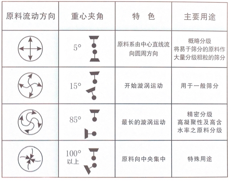 旋振篩采用振動電機或普通電機做動力源。工作時振動器軸高速旋轉,上下兩端的偏心重錘將電機的旋轉離心運動轉變?yōu)樗健⒋怪?、傾斜的三次元運動,再把這個運動傳遞給篩面。調節(jié)上下兩端重錘的相位角,可以改變物料在篩面上的運動軌跡,以達到不同的篩分效果。