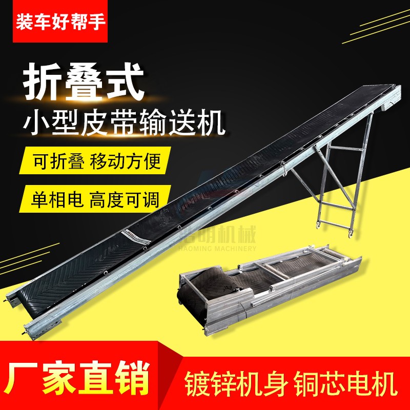 小型折疊皮帶輸送機可用于輸送袋裝糧食、紙箱、水泥袋子、肥料包等成品物件,同時也可用于輸送散裝物料。