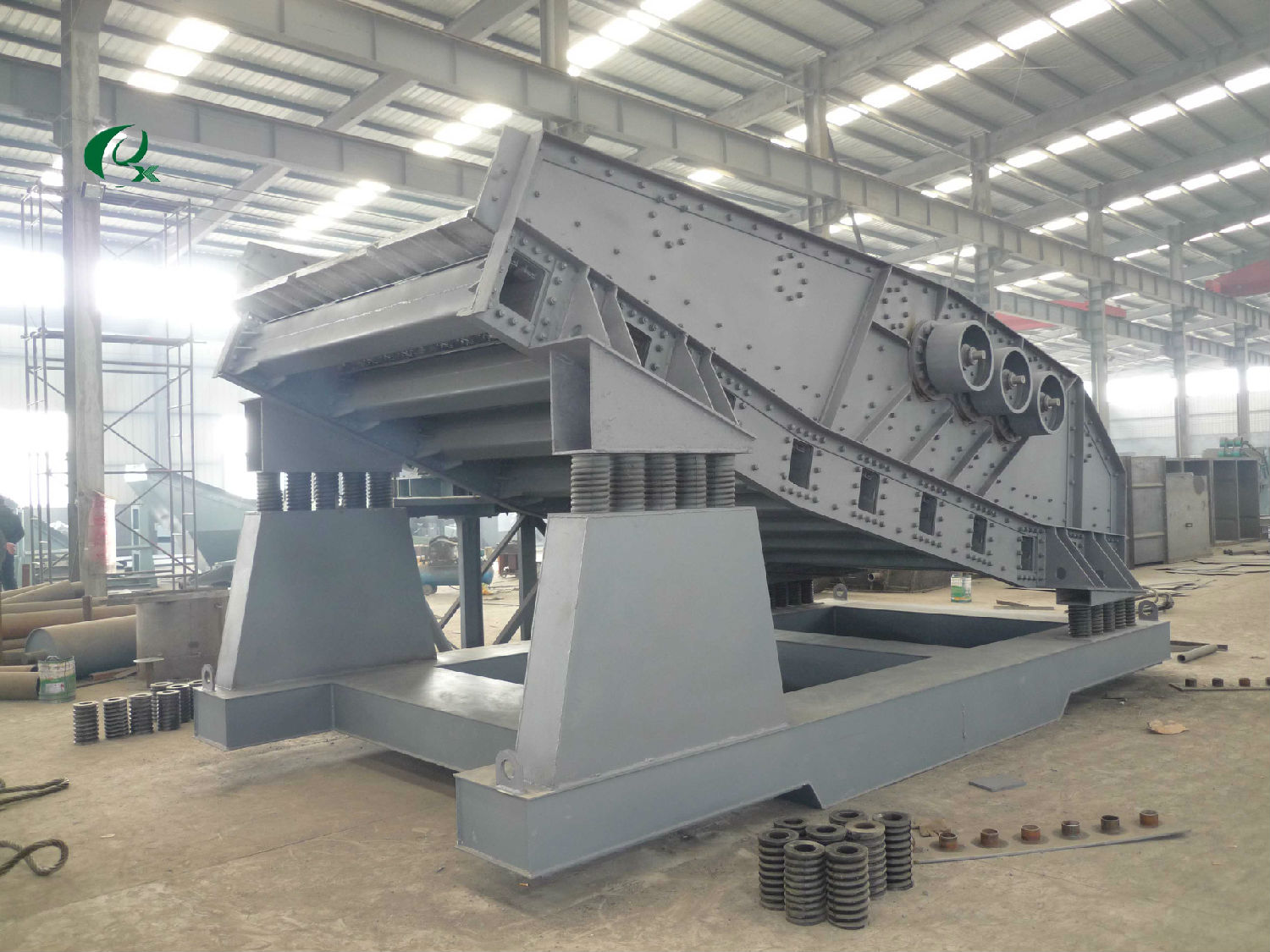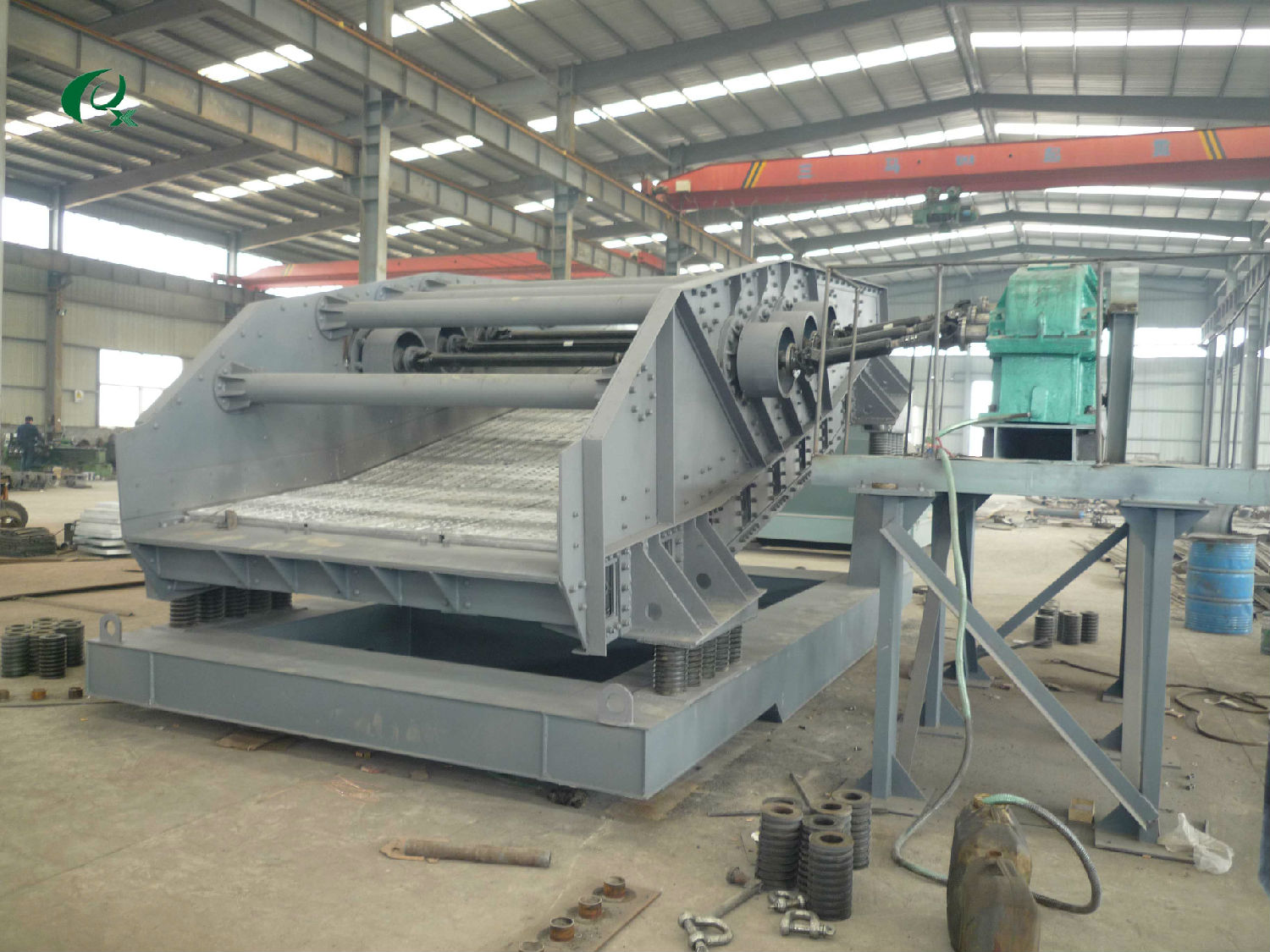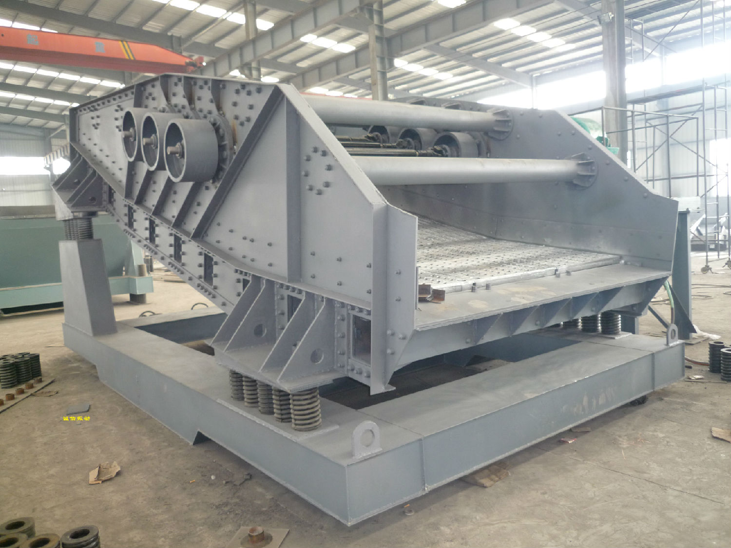 ZDS系列橢圓等厚篩的篩面由不同傾角的三段組成,使物料層在個(gè)篩面各段厚度近似相等,采用三軸 驅(qū)動(dòng),強(qiáng)迫同步激振原理。運(yùn)動(dòng)狀態(tài)穩(wěn)定,篩箱運(yùn)動(dòng)軌跡為橢圓。橢圓等厚篩分有利于物料在篩面上的向前輸送、分層和透篩,故與普通直線篩和圓振動(dòng)篩相比有較大的處理量和較高的篩分效率。而當(dāng)相同的處理量和相同的篩分效率時(shí),橢圓等厚篩具有較小的篩分面積,能節(jié)約投資。