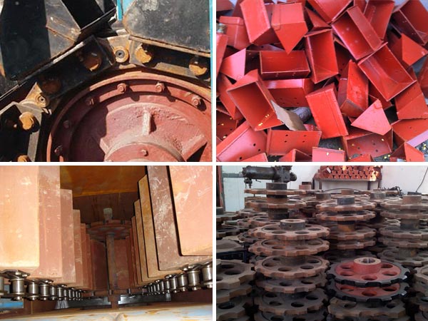 1.上部裝置:安裝有軌道(雙排道),防止鏈條擺動,逆止器,防止料斗回轉,物料阻滿下部機殼,卸料口裝有橡膠板防止回料。