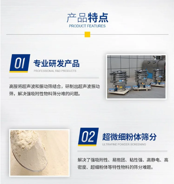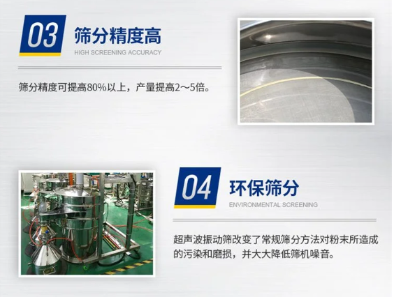 超聲波振動篩是將220v、50HZ或110v、60HZ電能轉(zhuǎn)化為38KHZ的高頻電能,輸入超聲換能器,將其變成38KHZ機械振動,從而達到高效篩分和清網(wǎng)的目的。改系統(tǒng)在傳統(tǒng)的振動篩基礎(chǔ)上再篩網(wǎng)上引入一個低振幅、高頻率的超聲波振動波(機械波)在篩網(wǎng)上面疊加一個高頻率低振幅的超聲振動儀,超微細粉體接受巨大的超聲加速度,使篩面上的物料始終保持懸浮狀態(tài),從而抑制粘附、摩擦、平降、等堵網(wǎng)因素。解決了強吸附性、易團聚、高靜電、高精細、高密度、輕比重等篩分難題,使超細微粉篩分不再難事,特別適合高品質(zhì)、精細粉體的用戶使用