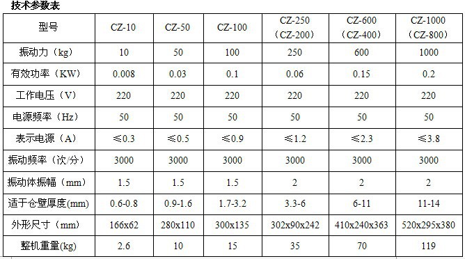 四、CZ600電磁倉(cāng)壁振動(dòng)器技術(shù)參數(shù)