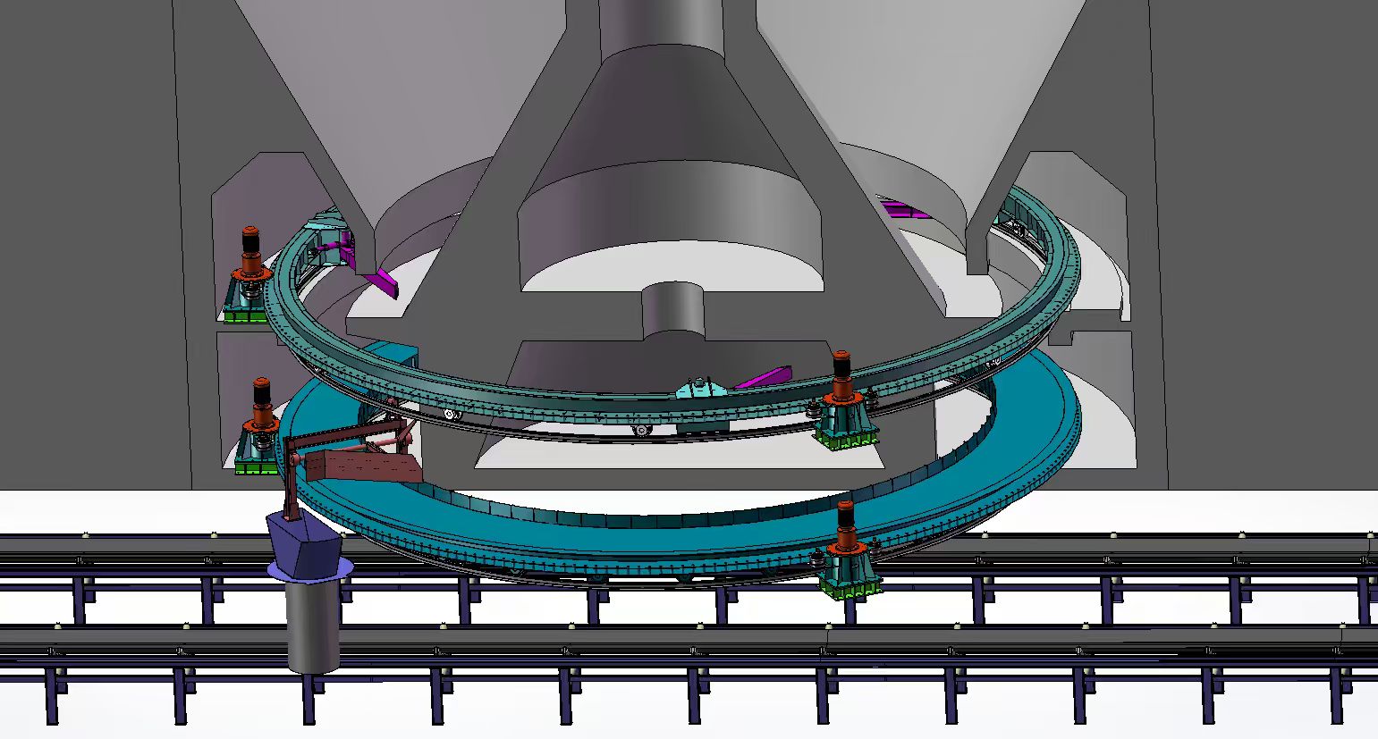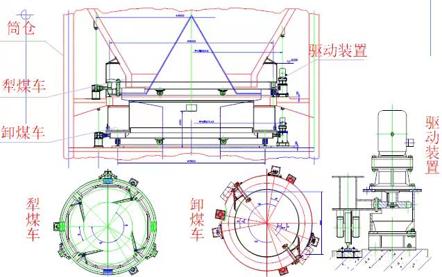 機(jī)工作時是沿圓弧軌道行走的,環(huán)式給煤機(jī)主要由犁煤車、卸煤車、驅(qū)動裝置(水平定位輪)、落煤斗、密封罩、電控系統(tǒng)組成。犁煤車和卸煤車回轉(zhuǎn)體為環(huán)形箱式結(jié)構(gòu),二者均由水平輪定位;驅(qū)動裝置對稱布置;采用銷齒傳動;可設(shè)置多個犁煤器并均勻分布。卸煤器安裝在卸煤車上方橫梁上,卸料器支架繞固定軸轉(zhuǎn)動,筒倉下口設(shè)環(huán)形縫隙式煤槽,并設(shè)置犁煤層,卸煤層和帶式輸送機(jī)層。犁煤車和卸煤車均由點(diǎn)擊減速機(jī)拖動,兩車運(yùn)行速度不同,方向相反。當(dāng)犁煤車運(yùn)轉(zhuǎn)時,位于筒倉底部的犁煤器把筒倉環(huán)式縫隙中犁下,落到運(yùn)行著的卸煤車上,繼而卸煤器把卸煤車承煤盤上的煤向密封罩外溢。根據(jù)需要,通過變頻器調(diào)節(jié)犁煤車轉(zhuǎn)速,實(shí)現(xiàn)連續(xù)調(diào)節(jié)環(huán)式給煤機(jī)出力。環(huán)式給煤機(jī)是輸煤系統(tǒng)中必不可少的關(guān)鍵設(shè)備之一,現(xiàn)已大量投放到各大電廠、煤礦、化工、焦炭等行業(yè)。