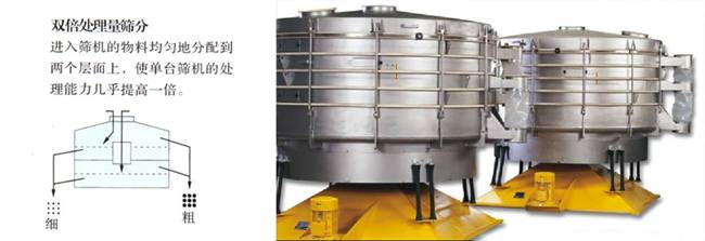 模仿人工搖擺篩、適合產(chǎn)量大、場地受限或者物料易破損(如微丸制粒工藝)使用的圓形搖擺篩。一臺圓形搖擺篩可以頂3-5臺旋振篩使用。 圓形搖擺篩是為了滿足大產(chǎn)量、高精度的篩分要求而特殊設(shè)計的一種多用途高效新型篩分機械設(shè)備,搖擺篩的運動軌跡更接近雙眼注視、雙手篩分的人工篩分,巧妙的把篩(平面圓周運動)、簸(向上拋物運動)結(jié)合起來,可通過調(diào)整徑向角和切向角,使篩分效果達到幾乎好的篩分效果。篩分精度可達到95%以上,處理量是普通篩機的3-5倍,篩網(wǎng)使用壽命也是常規(guī)篩分設(shè)備的5-10倍,適用于精細(xì)和超精細(xì)粉末與微粒物料的篩分,特別適合難處理、不好篩、高產(chǎn)量的篩分工藝。